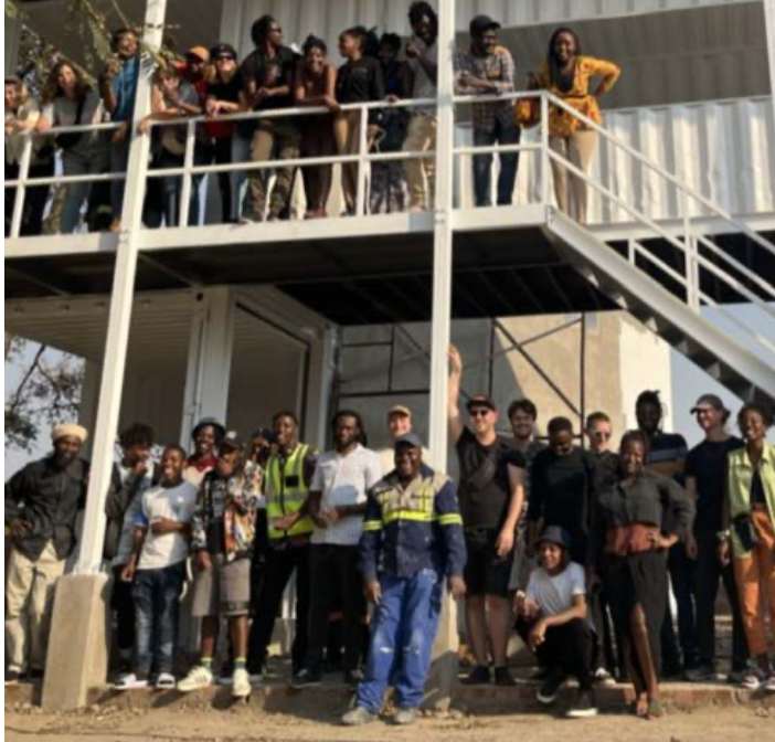 Eight German graduate students spent one month in Harare in August 2023 to execute projects on the stacked shipping container project that had been erected prior to their arrival. Students built work surfaces from sustainably harvested Teak wood offcuts and designed and welded a suspended steel framework to display art.